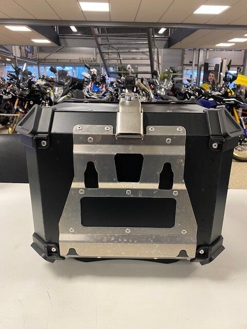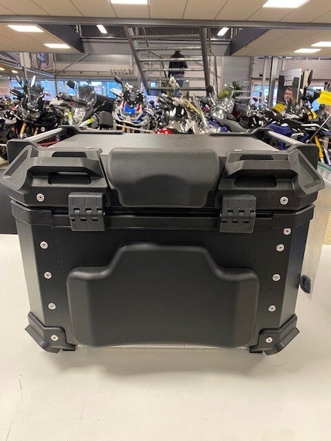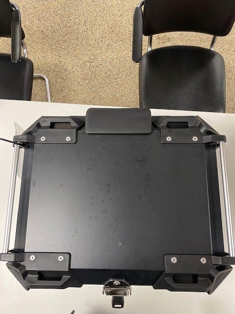 Topkoffer met rugsteun en bevevestigingsplaat en twee sleutel.
